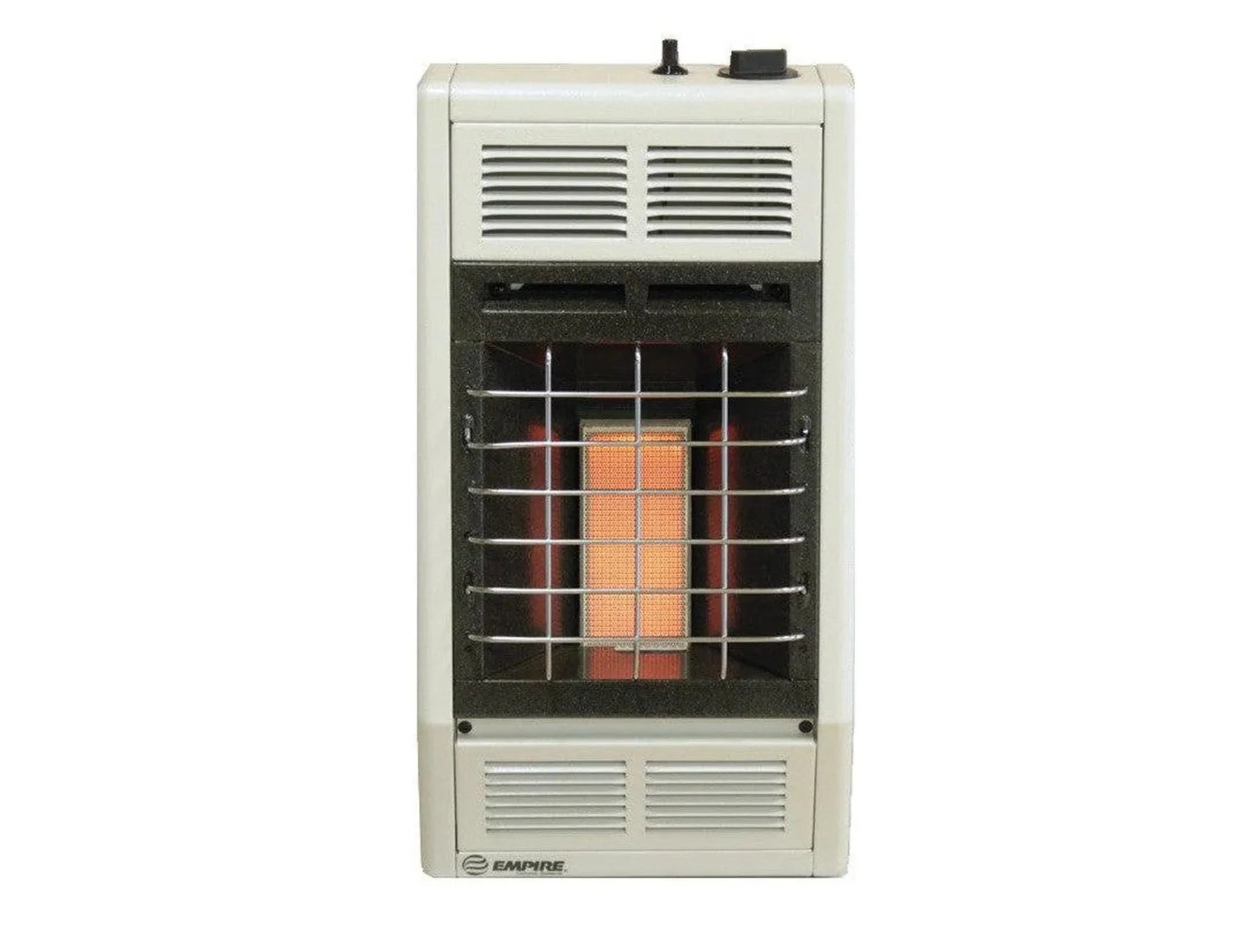 The Empire is a compact vent-free radiant heater designed for propane gas operation with built-in thermostat control. Using radiant heating technology, it delivers direct, comfortable warmth that heats objects and people in the room rather than circulating air. The vent-free design allows flexible installation without chimneys or flues, making it ideal for small living spaces, bedrooms, or supplemental heating applications. Thermostat control helps maintain consistent comfort automatically.