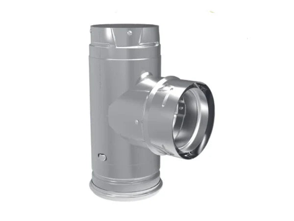 The Majestic PelletVent Pro 3" Single Tee with Clean-Out Tee Cap is designed for easy connection and maintenance in your pellet stove venting system. This tee allows the vent pipe to branch at a 90° angle while providing a convenient clean-out access point. Built from durable, corrosion-resistant stainless steel and featuring a twist-lock connection system, it ensures a secure, leak-proof fit for efficient venting. Ideal for use with PelletVent Pro systems, this single tee is perfect for installations where venting direction changes are required, while allowing easy removal of ash and soot buildup.