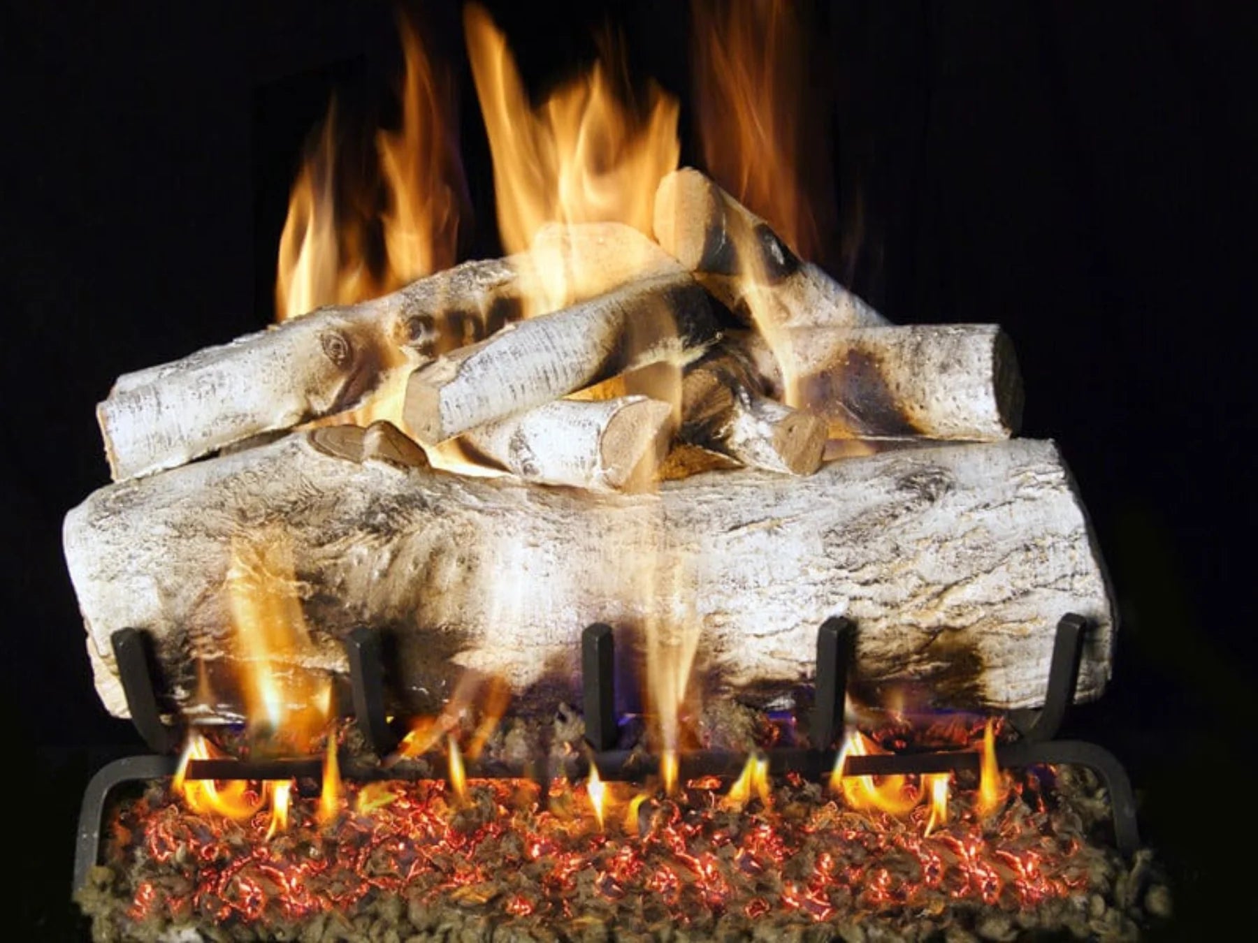 Real Fyre Mountain Birch Woodland See-Thru Series 24″ gas log set features light birch tones with refined branch detailing. Designed for vented two-sided fireplaces, it delivers bright flame contrast, balanced dual-view fire presentation, and natural woodland styling for medium-size see-through hearth applications.