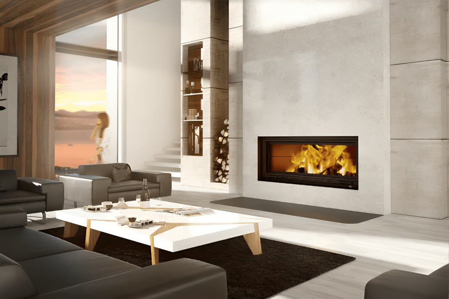 The fireplace allows for wood loading over the width, and the guillotine door slides open for easy access.